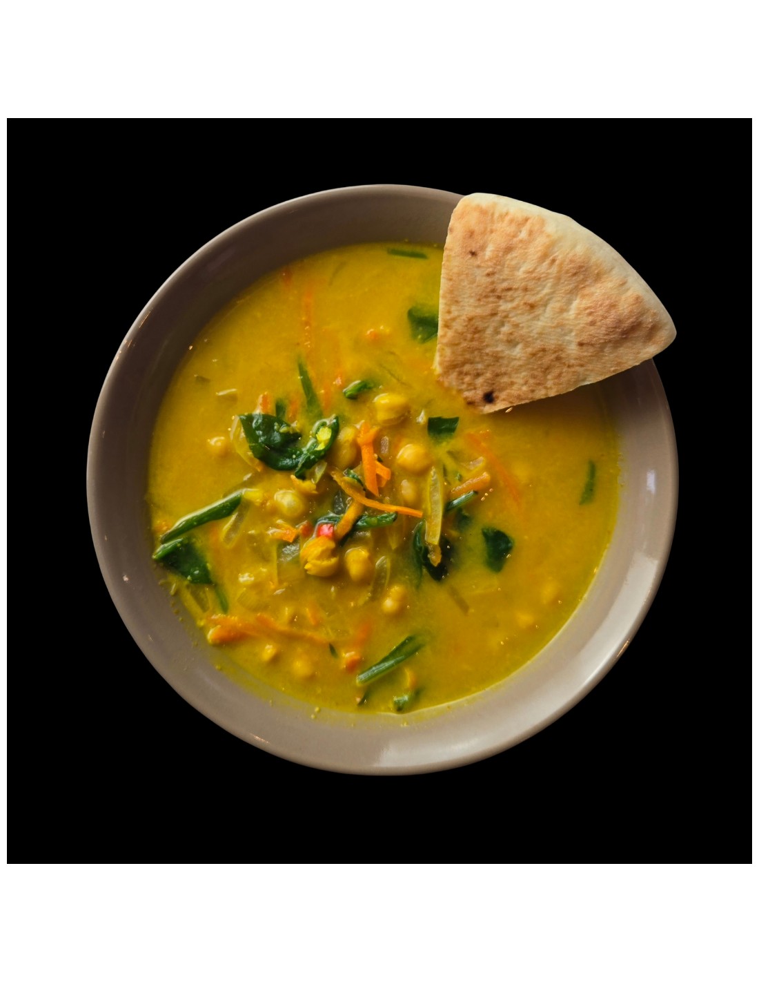 [value] => Ingrédients : bouillon de légumes, pois chiches, oignon, carottes, pita (blé, sucre, levure, sel, amylase), lait de coco, épinards, graines de sésame, miso, sauce soja sans gluten, gingembre, ail, huile d’olive, piment, poivre noir.